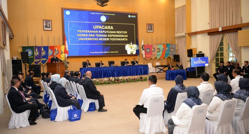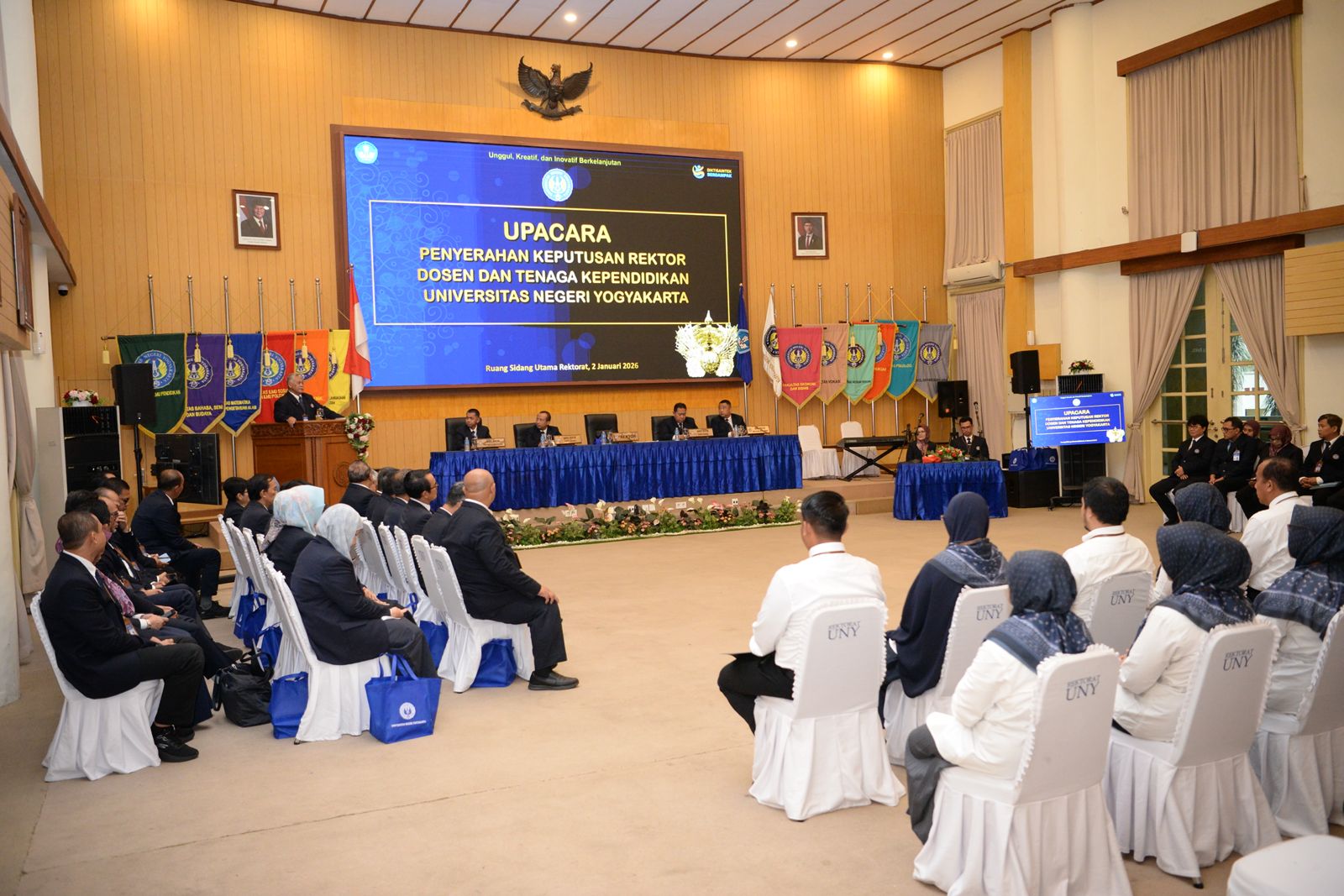 Universitas Negeri Yogyakarta (UNY) memulai lembaran tahun 2026 dengan langkah strategis dalam penguatan Sumber Daya Manusia (SDM). Pada hari Jumat (2/1/2026), bertempat di Ruang Sidang Utama Rektorat, UNY menggelar Upacara Penyerahan Keputusan Rektor kepada sejumlah Dosen dan Tenaga Kependidikan (Tendik).