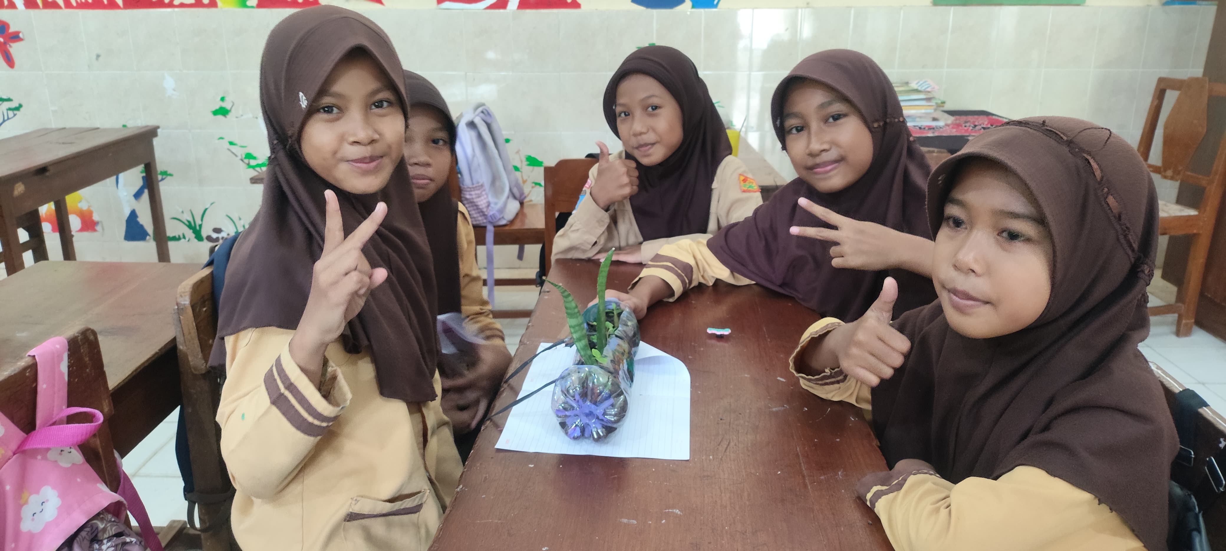 Selain pemaparan materi, kegiatan dilanjutkan dengan praktik langsung penanaman tanaman. Siswa diberikan botol bekas, cat, kuas, tanah, serta bibit tanaman untuk berkreasi membuat pot dari barang daur ulang. Botol-botol tersebut kemudian dihias secara berkelompok dan dimanfaatkan sebagai media tanam. Aktivitas ini tidak hanya melatih kreativitas siswa, tetapi juga menanamkan nilai kepedulian terhadap pengelolaan sampah dan pemanfaatan barang bekas.