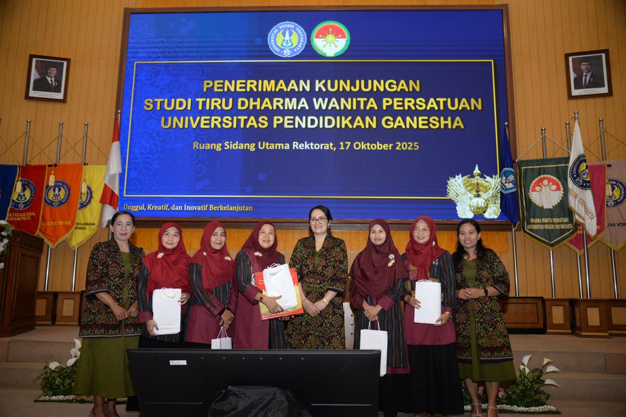Dharma Wanita Persatuan (DWP) Universitas Pendidikan Ganesha (Undiksha) melakukan kunjungan studi banding ke DWP Universitas Negeri Yogyakarta (UNY) untuk mempelajari berbagai praktik baik dalam pemberdayaan organisasi. Rombongan yang dipimpin oleh Ketua DWP Undiksha, Ny. Suastini Lasmawan, diterima langsung oleh Rektor UNY, Prof. Dr. Sumaryanto, M.Kes., AIFO, dan Ketua DWP UNY, Ny. Sulastri Sumaryanto, beserta jajarannya.