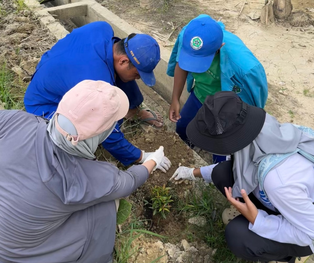 Upaya pemulihan lingkungan pascabanjir bandang di Desa Seuneubok Aceh, Kecamatan Bendahara, Kabupaten Aceh Tamiang, terus dilakukan melalui berbagai inisiatif kolaboratif. Mahasiswa Kuliah Kerja Nyata (KKN) Kemanusiaan kolaborasi Universitas Negeri Yogyakarta (UNY) dan Universitas Samudra menggagas aksi penghijauan dengan menanam 60 bibit pohon pucuk merah di sejumlah titik desa.