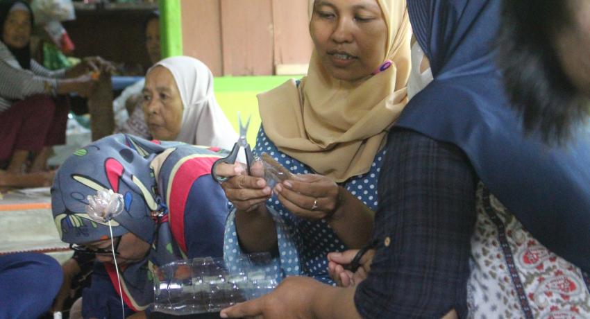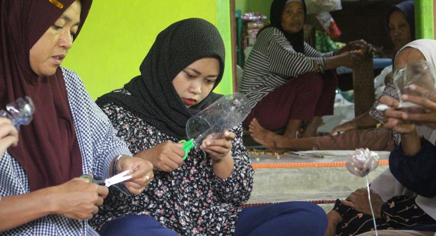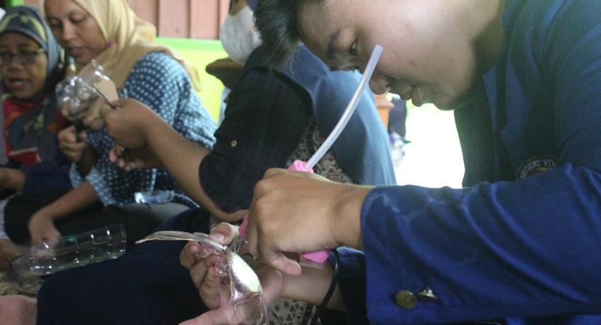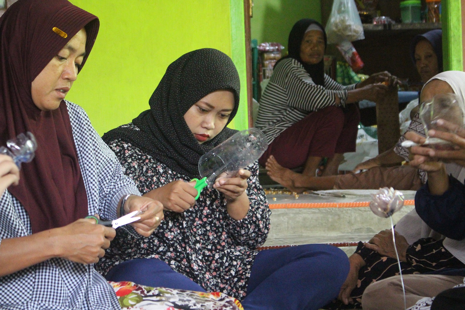 Dalam sesi praktik, mahasiswa KKN memandu warga membuat bunga dari botol plastik bekas. Proses pembuatan dimulai dari membuat pola kelopak bunga menggunakan kardus, memotong botol plastik sesuai pola, membentuk kelopak dengan pemanasan ringan agar menyerupai bunga asli, hingga merangkainya menggunakan kawat dan lem tembak. Tahap akhir dilakukan dengan pemberian warna dan penataan menggunakan floral tape sehingga menghasilkan bunga hias yang menarik dan tahan lama.