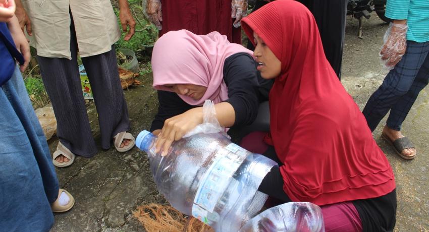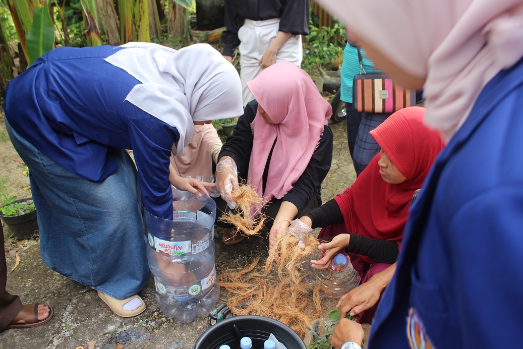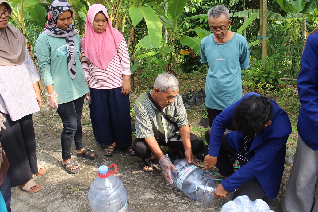 Selain penyampaian materi, mahasiswa KKN juga mengajak masyarakat mengikuti praktik langsung pembuatan komposter sederhana menggunakan galon atau ember bekas. Komposter ini digunakan untuk mengolah sampah organik seperti sisa sayur, kulit buah, dan daun kering melalui proses fermentasi dengan bantuan aktivator seperti EM4 dan larutan molase.