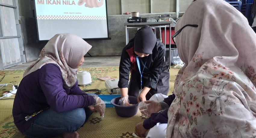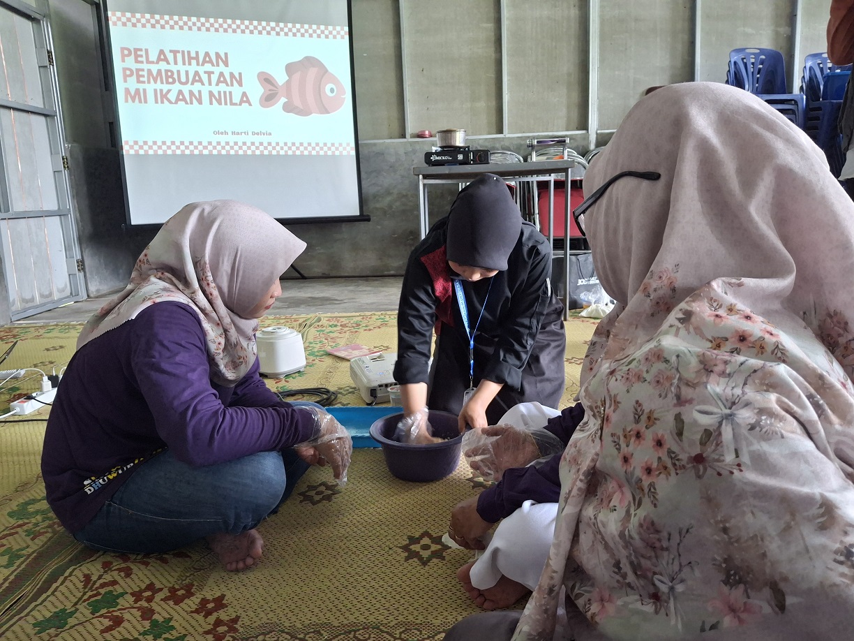 Resep mie ikan nila cukup sederhana dan bisa diproduksi rumahan. Komposisinya terdiri dari 155gram tepung protein tinggi, 100gram daging ikan nila, garam, jeruk nipis, serta tepung tapioka secukupnya. Ikan nila difillet, dimarinasi dengan jeruk nipis, lalu dihaluskan. Daging ikan dicampur dengan tepung dan diuleni hingga kalis, digilas menggunakan alat penggiling mie, dipotong, kemudian direbus ±3–5 menit hingga matang. Pelatihan juga dilengkapi dengan teknik penyimpanan dan cara menjaga tekstur mie agar tidak mudah lengket dan tahan simpan.