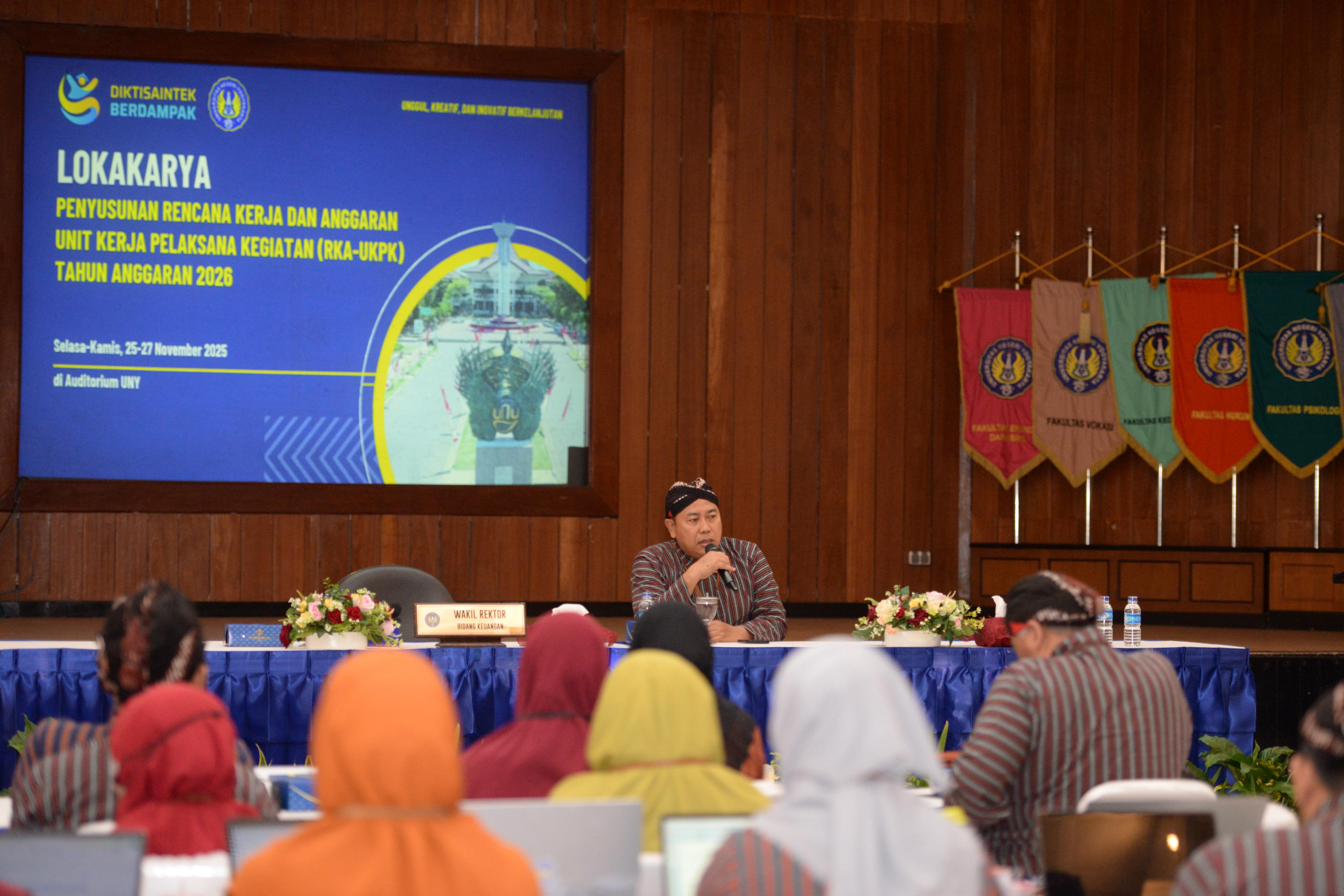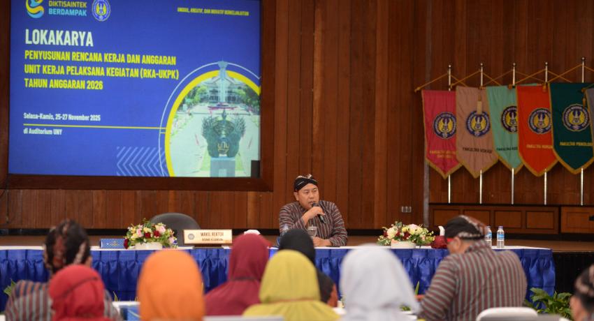 Universitas Negeri Yogyakarta (UNY) sukses menyelenggarakan Lokakarya Penyusunan Rencana Kerja dan Anggaran Unit Kerja Pelaksana Kegiatan (RKA-UKPK) untuk Tahun Anggaran 2026. Kegiatan strategis ini berlangsung selama tiga hari, mulai Selasa hingga Kamis (25–27 November 2025), bertempat di Auditorium UNY.