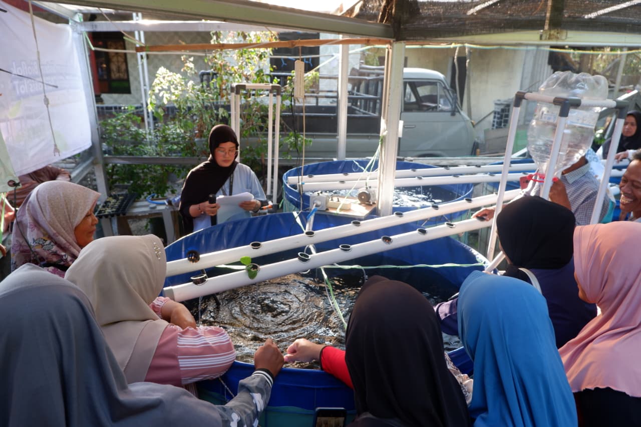 Para peserta mempraktikkan Penyemaian Hidroponik yaitu peserta mempraktikkan cara menanam sayuran dengan sistem hidroponik, yang lebih ramah lingkungan dan hemat lahan, Fermentasi Bioflok yaitu warga dilatih memanfaatkan mikroorganisme untuk menjaga kualitas air kolam, sehingga lele tumbuh sehat tanpa membutuhkan banyak penggantian air. Selain juga praktik Pengelolaan IoT Feed and Care, disini mahasiswa mendampingi warga dalam penggunaan perangkat IoT untuk pakan otomatis dan monitoring kolam, sehingga teknologi benar-benar dapat dirasakan manfaatnya oleh masyarakat.