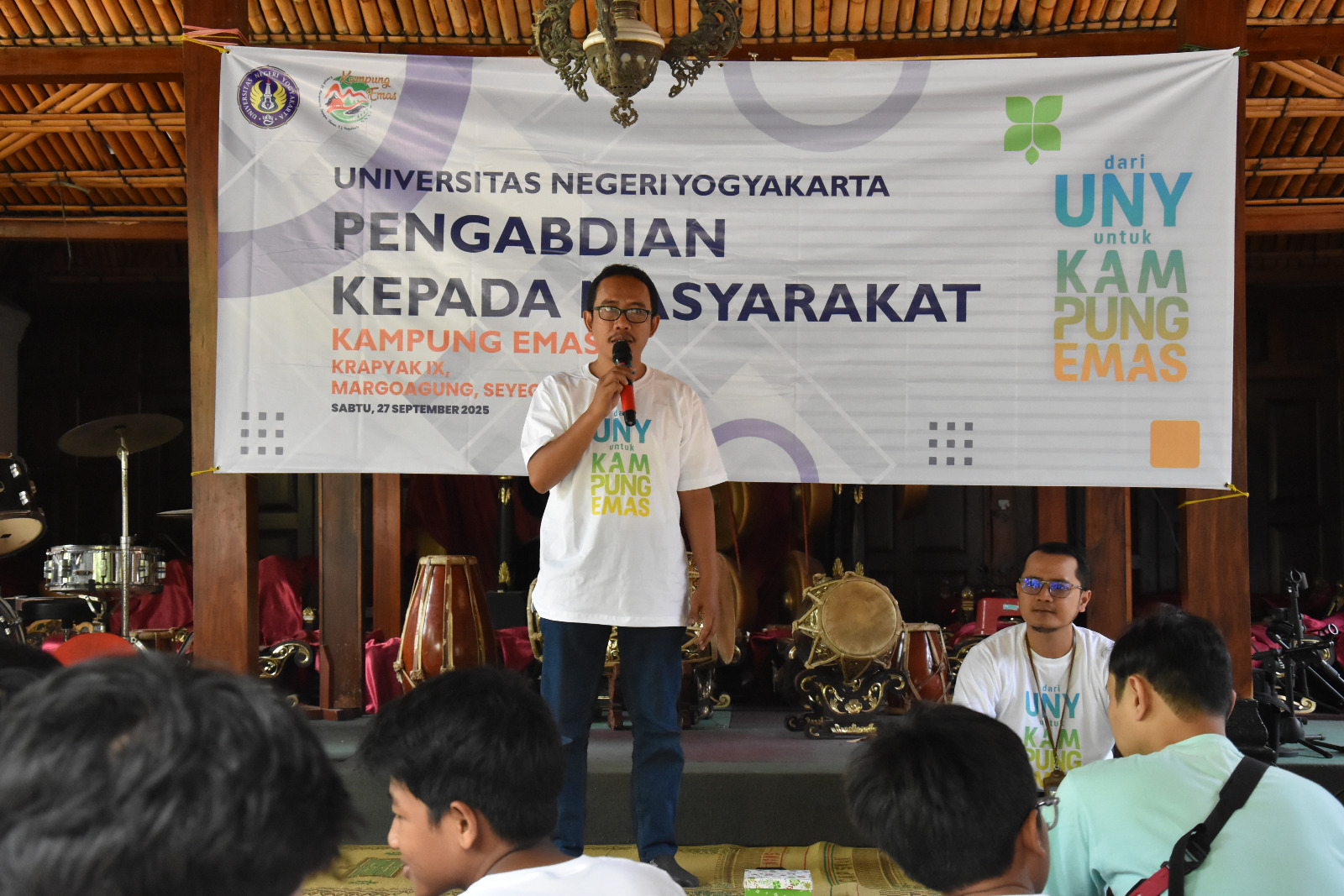 Pengabdian kepada Masyarakat yang dilaksanakan pada Sabtu (27/9) di Kampung Emas Seyegan Dusun Krapyak IX, Margoagung, Seyegan, Sleman, DIY ini merupakan PkM dengan skema Institusional Rektor dan Sekretaris Rektor UNY. Rektor UNY, Prof. Dr. Sumaryanto yang juga merupakan ketua tim PkM mengawali arahannya menyampaikan bahwa Kampung Emas Krapyak IX memiliki sembilan program utama, yang disebut sebagai ‘Program Sembilan Berkah’. Diantaranya adanya pendidikan berkah, bahwa untuk menjadi orang yang sukses itu harus dipersiapkan sejak dini dengan pendidikan yang baik, juga perlu membekali diri dengan teknologi yang berkembang, salah satunya yaitu media digital. Dengan mengikuti PkM ini diharapkan warga masyarakat sekitar dapat mencapai kesuksesan.