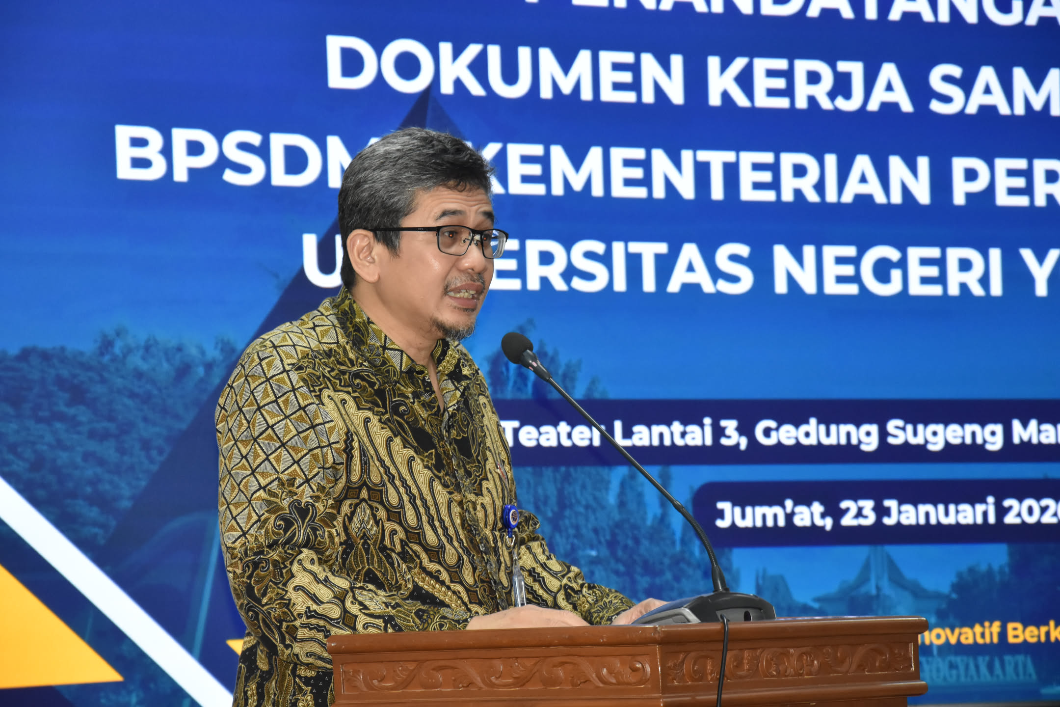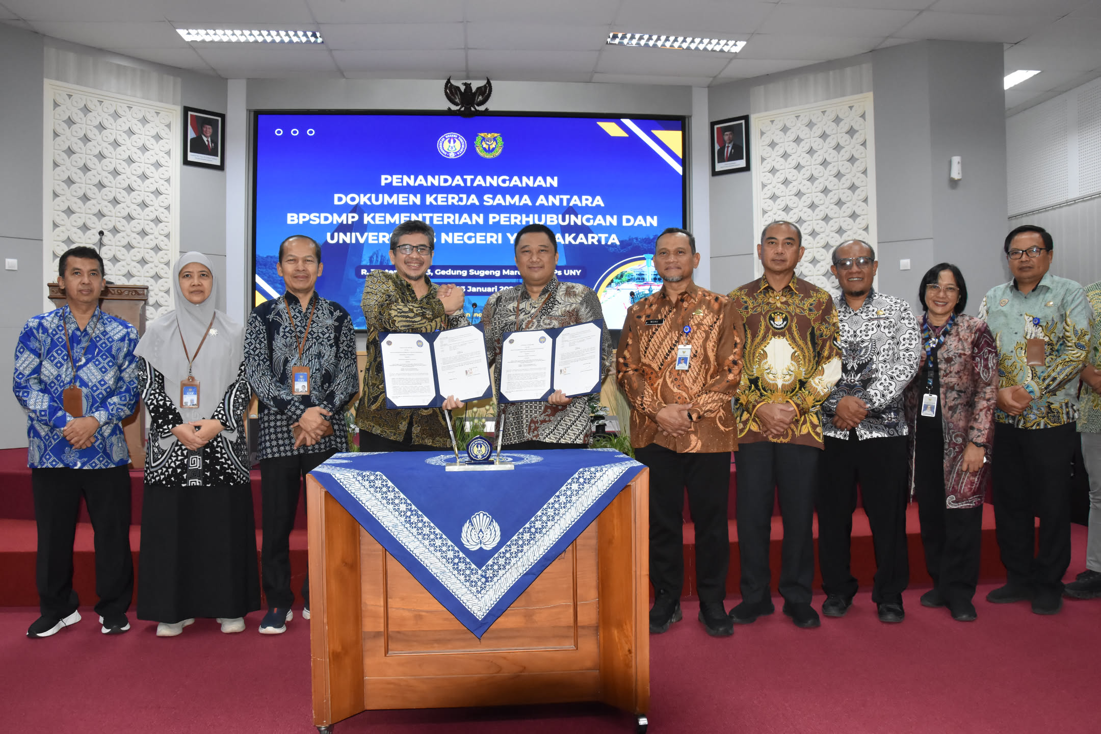 Universitas Negeri Yogyakarta (UNY) resmi menandatangani kerja sama dengan Badan Pengembangan Sumber Daya Manusia Perhubungan (BPSDMP) Kementerian Perhubungan Republik Indonesia dalam rangka penguatan sinergi pengembangan sumber daya manusia, pendidikan, penelitian, dan pengabdian kepada masyarakat. Kegiatan ini dilaksanakan pada Jumat, 23 Januari 2025, bertempat di Ruang Teater Lantai 3, Gedung Sugeng Mardiono, Sekolah Pascasarjana UNY.