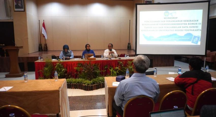 Universitas Negeri Yogyakarta (UNY) menyelenggarakan Workshop dan Sosialisasi Permendikbudristek RI Nomor 55 Tahun 2024 Tentang Pencegahan dan Penanganan Kekerasan Di Lingkungan Perguruan Tinggi pada tanggal 23 Desember 2025, di ruang pertemuan Hotel UNY. Kegiatan ini dihadiri oleh Kepala Bagian Tata Usaha Fakultas dan Sekolah Pascasarjana, Kepala Bagian dan Sekretaris Bagian pada Direktorat, Kepala Unit Perpustakaan, Unit Layanan Bimbingan Konseling dan Unit Layanan Kearsipan. Workshop ini menjadi ruang diskusi tentang penanganan dan pencegahan kekerasan di perguruan tinggi. Kegiatan ini diprakarsai oleh Satgas Pencegahan dan Penanganan Kekerasan Universitas Negeri Yogyakarta (Satgas PPK UNY).