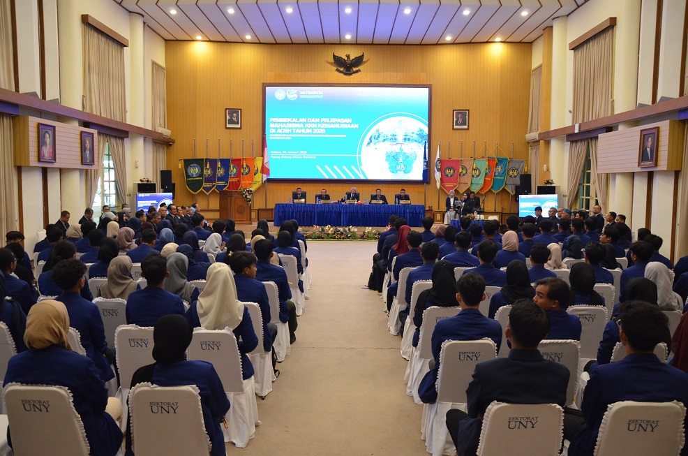 Universitas Negeri Yogyakarta (UNY) secara resmi melepas mahasiswa peserta Kuliah Kerja Nyata (KKN) Kemanusiaan Semester Genap Tahun Akademik 2025/2026 yang akan diberangkatkan ke Provinsi Aceh. Kegiatan pembekalan sekaligus pelepasan dilaksanakan pada Selasa (6/1/26) di Ruang Sidang Utama Rektorat sebagai bagian dari persiapan akhir sebelum mahasiswa diterjunkan ke lokasi pengabdian pada 8 Januari 2026.