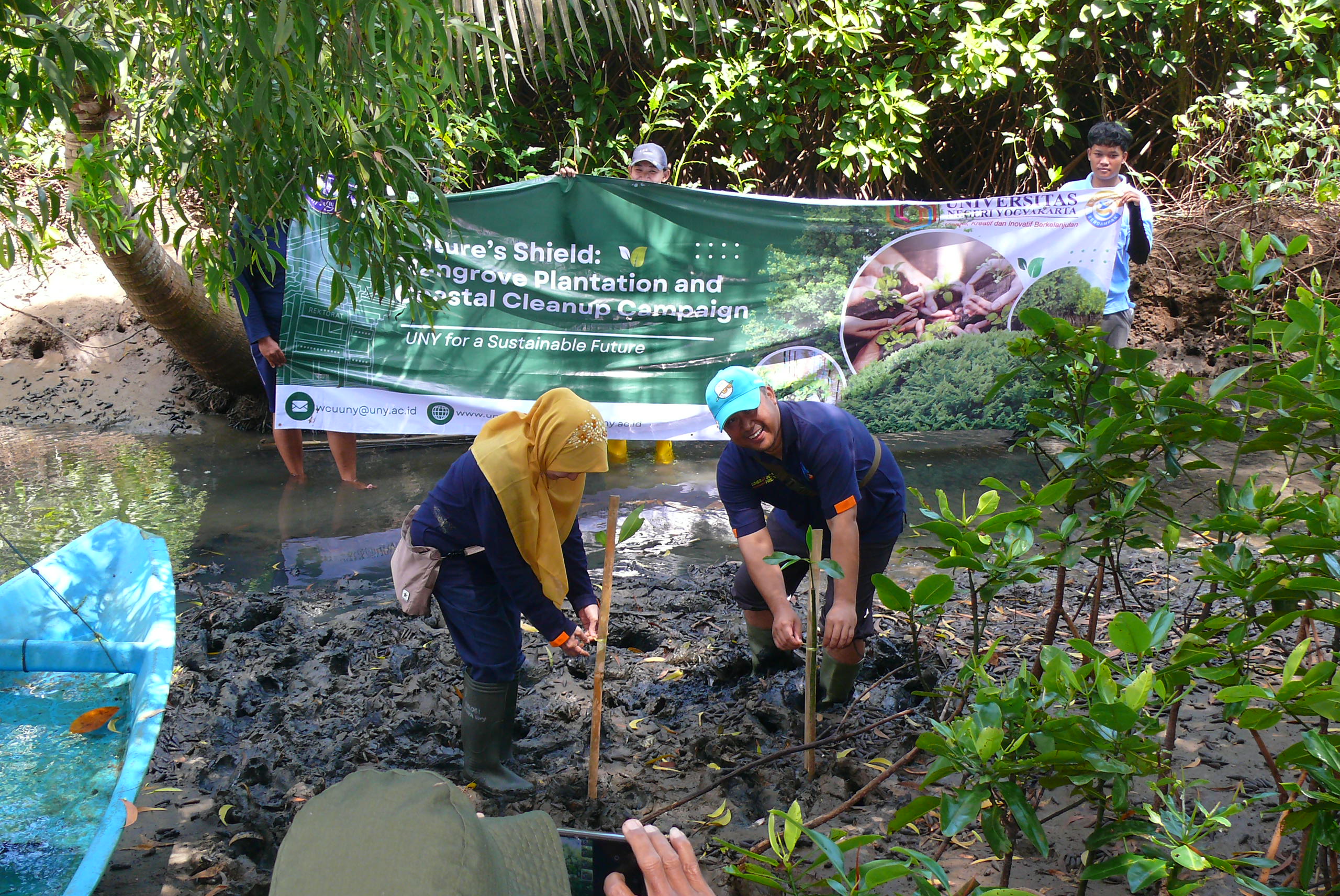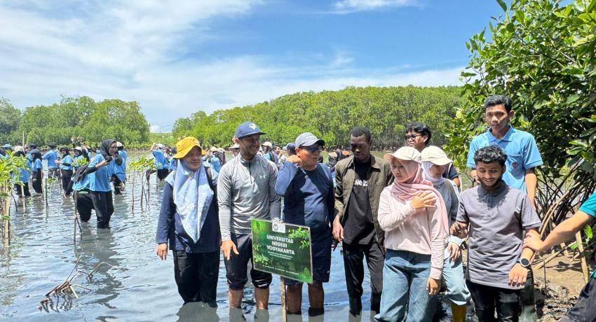 Universitas Negeri Yogyakarta (UNY) kembali menegaskan komitmennya dalam menjaga kelestarian lingkungan dengan melaksanakan penanaman pohon mangrove di kawasan pesisir Pantai Pasir Mendit, Jangkaran, Temon, Kulon Progo, pada Minggu (12/10/25). Kegiatan ini merupakan bagian dari kontribusi UNY dalam mendukung Tujuan Pembangunan Berkelanjutan (SDGs) khususnya poin ke-13 (Penanganan Perubahan Iklim), poin ke-14 (Kehidupan perairan), dan poin ke-15 (Ekosistem Daratan), sekaligus memperkuat peran UNY dalam pemeringkatan UI GreenMetric (UIGM), yang menilai kampus berdasarkan praktik keberlanjutan lingkungan.