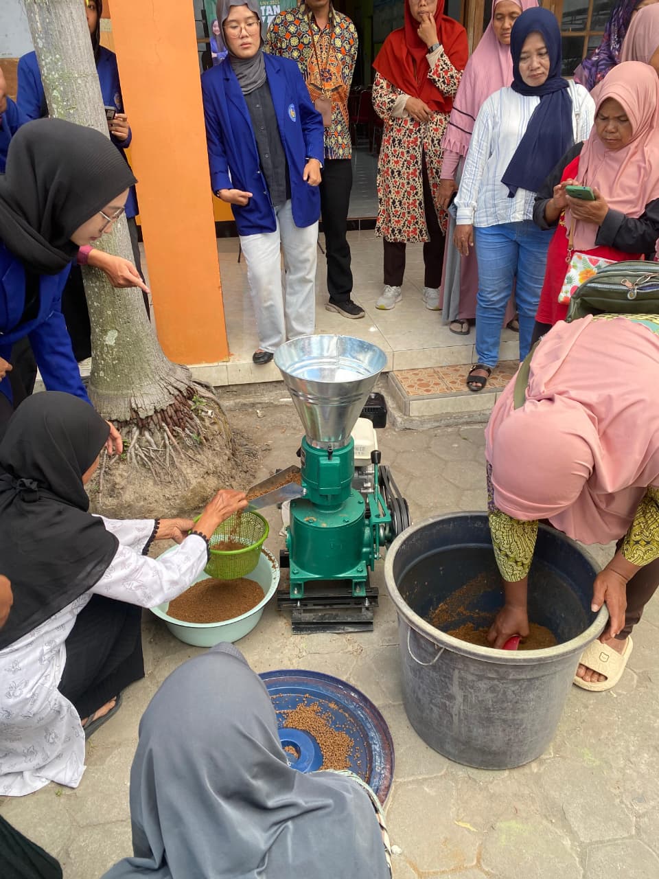 Setelah sesi materi, kegiatan dilanjutkan dengan demonstrasi pembuatan pakan ikan lele secara langsung oleh Nasywa Safira Ardhani, Nurmala Jati, dan Khusni Amri. Peserta diajak melihat dan mempraktikkan proses mulai dari pencampuran bahan, fermentasi, hingga pencetakan pakan dengan menggunakan alat pencetak pelet “feedsmart” rakitan tim PRAJA. Antusiasme masyarakat tampak dari keaktifan peserta yang berdiskusi dan mencoba langsung proses pembuatan pakan alternatif ini.
