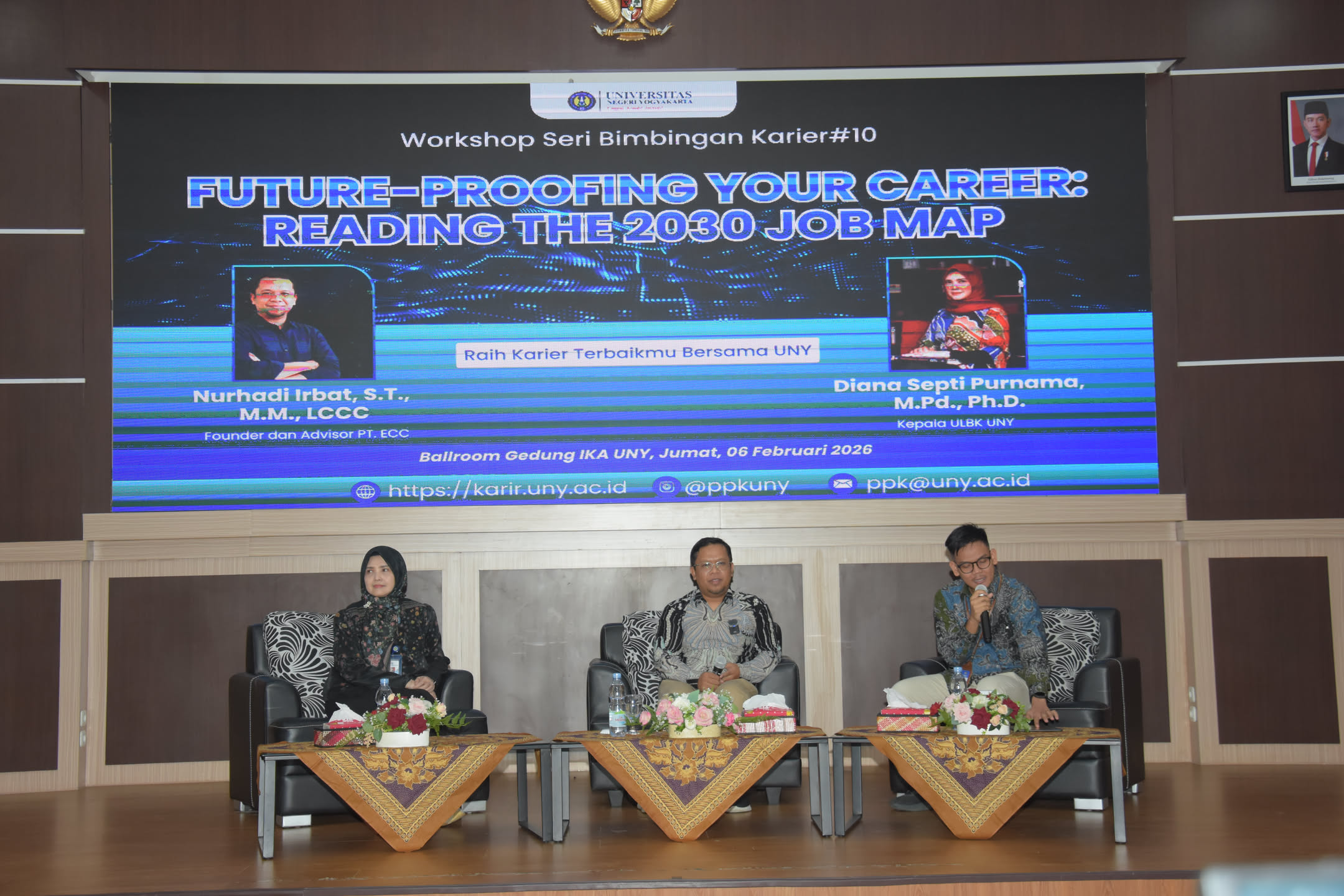 Direktorat Kemahasiswaan dan Alumni Universitas Negeri Yogyakarta (UNY) kembali menyelenggarakan Workshop Seri Bimbingan Karier (WSBK) #10 bertema “Future-Proofing Your Career: Reading the 2030 Job Map” pada Jumat (6/2) pukul 12.30 WIB di Ballroom Gedung Alumni IKA UNY Lantai 2. Kegiatan ini diikuti oleh 1.143 peserta yang terdiri dari mahasiswa dan alumni seluruh fakultas dan Sekolah Pascasarjana, dengan 286 peserta luring dan 857 peserta daring.