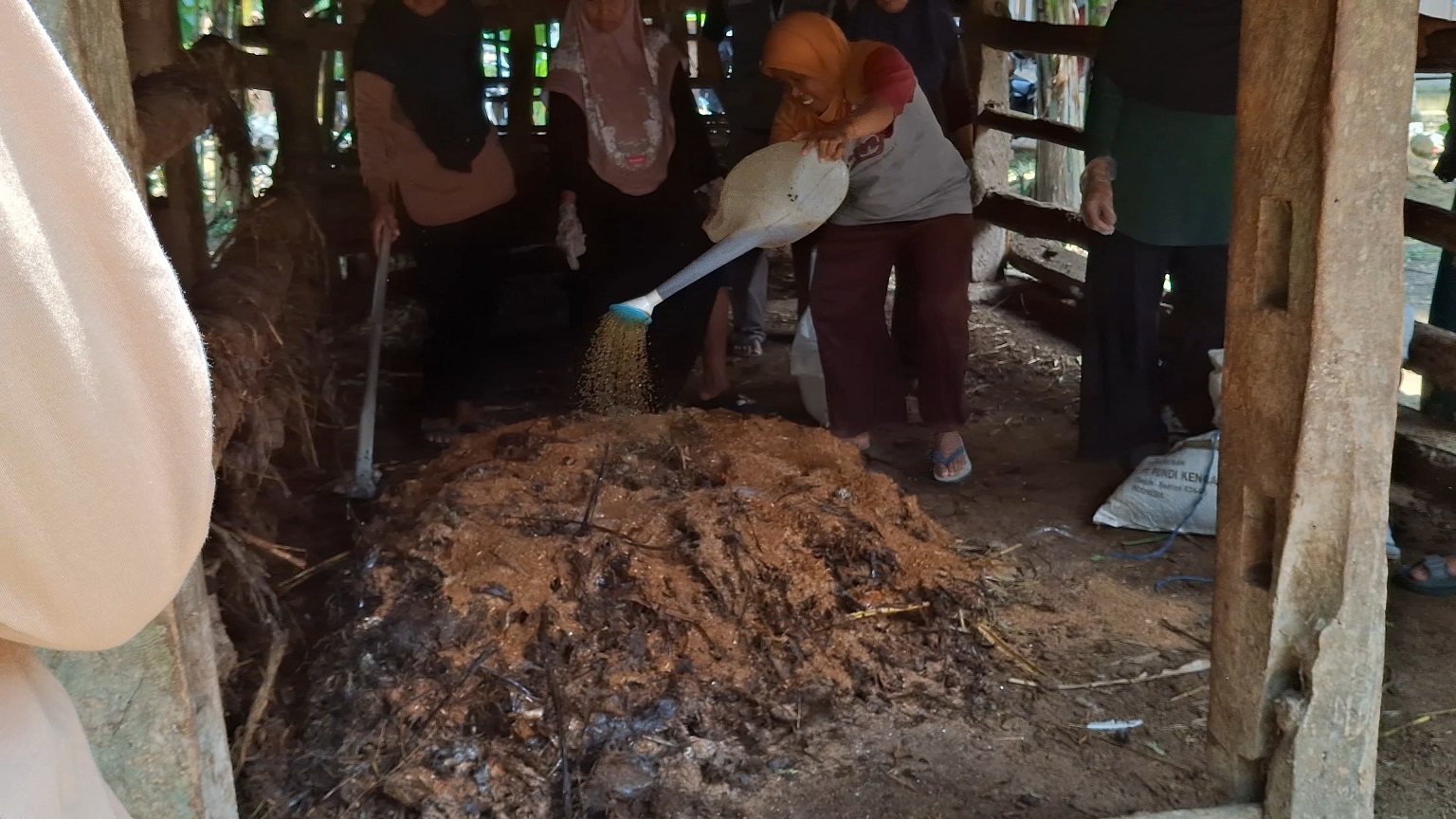 Pada sesi praktik, peserta diajak membuat pupuk organik dari kotoran sapi kering yang dicampur dengan bekatul, dolomit, tetes tebu, dan aktivator mikroorganisme (EM4). Campuran tersebut kemudian disemprot dan ditutup rapat menggunakan plastik UV selama tiga minggu hingga menghasilkan pupuk padat yang tidak berbau dan kaya unsur hara. Proses sederhana ini membuat peserta antusias karena dapat langsung diterapkan di rumah atau lahan pertanian mereka.