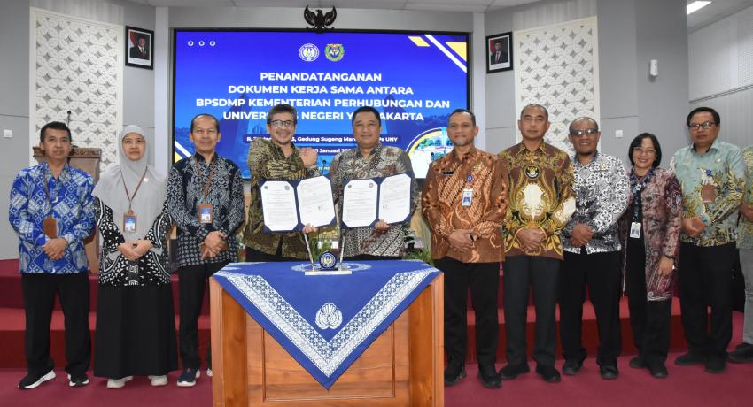 Universitas Negeri Yogyakarta (UNY) resmi menandatangani kerja sama dengan Badan Pengembangan Sumber Daya Manusia Perhubungan (BPSDMP) Kementerian Perhubungan Republik Indonesia dalam rangka penguatan sinergi pengembangan sumber daya manusia, pendidikan, penelitian, dan pengabdian kepada masyarakat. Kegiatan ini dilaksanakan pada Jumat, 23 Januari 2025, bertempat di Ruang Teater Lantai 3, Gedung Sugeng Mardiono, Sekolah Pascasarjana UNY.
