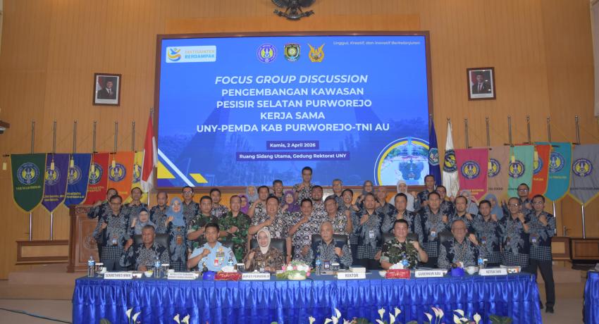 Universitas Negeri Yogyakarta (UNY) bersama Pemerintah Kabupaten Purworejo dan TNI Angkatan Udara menggelar Focus Group Discussion (FGD) tentang pengembangan Kawasan Pesisir Selatan Purworejo di Ruang Sidang Utama Rektorat UNY, Kamis (2/4/2026). Forum ini menjadi langkah awal untuk memperkuat sinergi antarlembaga dalam merancang kerja sama strategis di bidang pendidikan, penelitian, pemberdayaan masyarakat, pelayanan kesehatan, hingga penguatan pertahanan kawasan.