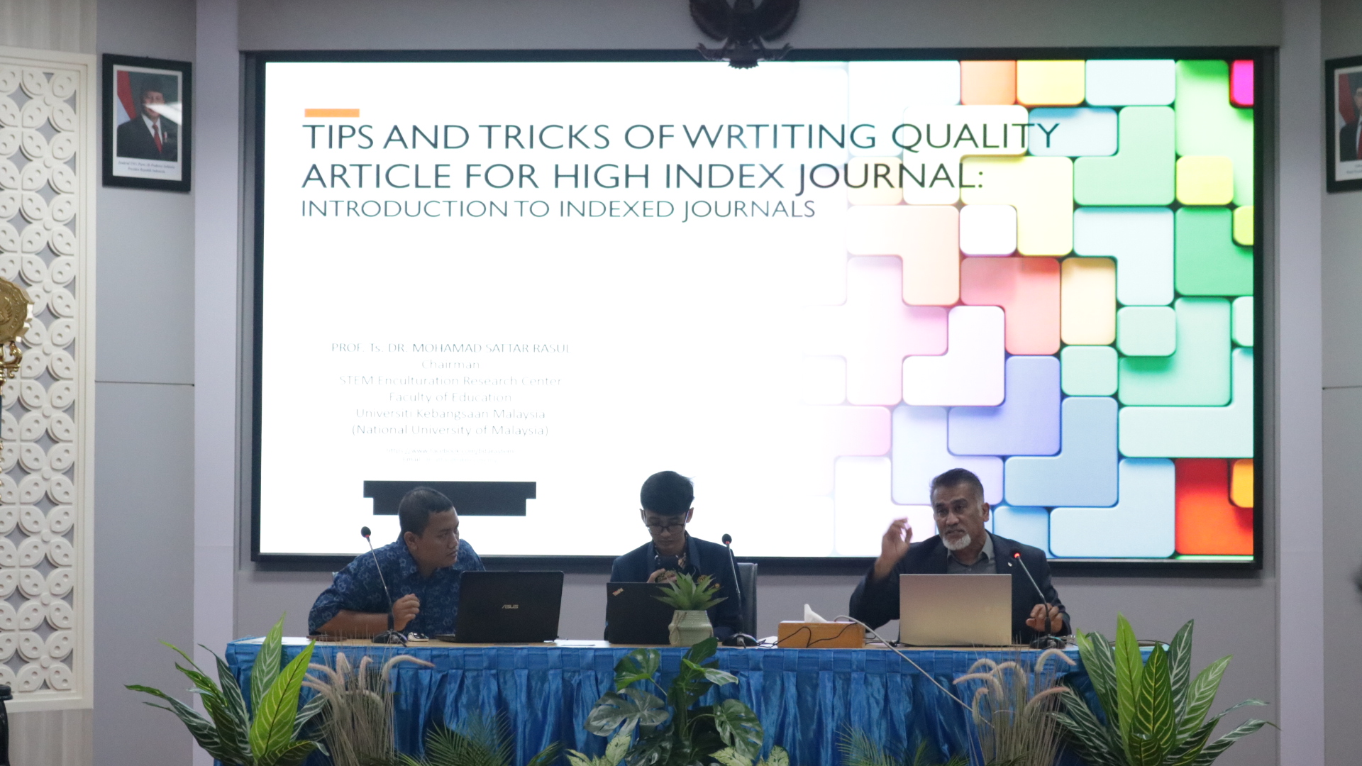 Dalam sesi akademik, Prof. Sattar mengulas strategi publikasi ilmiah bereputasi melalui pengenalan ekosistem indexed journals (WoS/Scopus) beserta metriknya (IF, kuartil) dan cara menilai kesesuaian naskah dengan cakupan jurnal. Ia menekankan urgensi memilih basis data bibliografis yang kredibel serta memahami standar kualitas sebelum mengirimkan manuskrip.