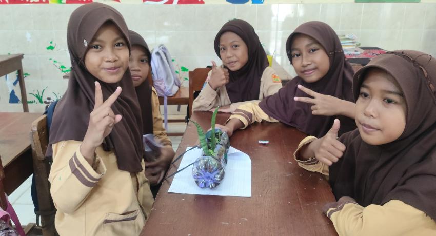 Selain pemaparan materi, kegiatan dilanjutkan dengan praktik langsung penanaman tanaman. Siswa diberikan botol bekas, cat, kuas, tanah, serta bibit tanaman untuk berkreasi membuat pot dari barang daur ulang. Botol-botol tersebut kemudian dihias secara berkelompok dan dimanfaatkan sebagai media tanam. Aktivitas ini tidak hanya melatih kreativitas siswa, tetapi juga menanamkan nilai kepedulian terhadap pengelolaan sampah dan pemanfaatan barang bekas.