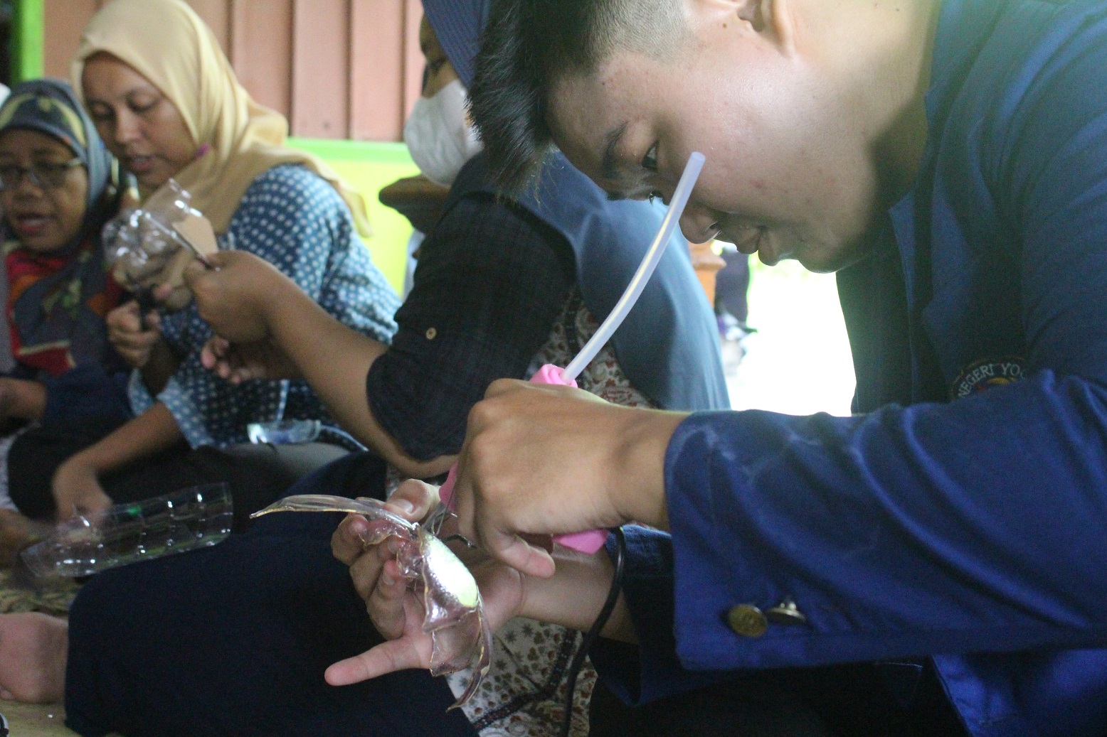 Dalam sesi praktik, mahasiswa KKN memandu warga membuat bunga dari botol plastik bekas. Proses pembuatan dimulai dari membuat pola kelopak bunga menggunakan kardus, memotong botol plastik sesuai pola, membentuk kelopak dengan pemanasan ringan agar menyerupai bunga asli, hingga merangkainya menggunakan kawat dan lem tembak. Tahap akhir dilakukan dengan pemberian warna dan penataan menggunakan floral tape sehingga menghasilkan bunga hias yang menarik dan tahan lama.