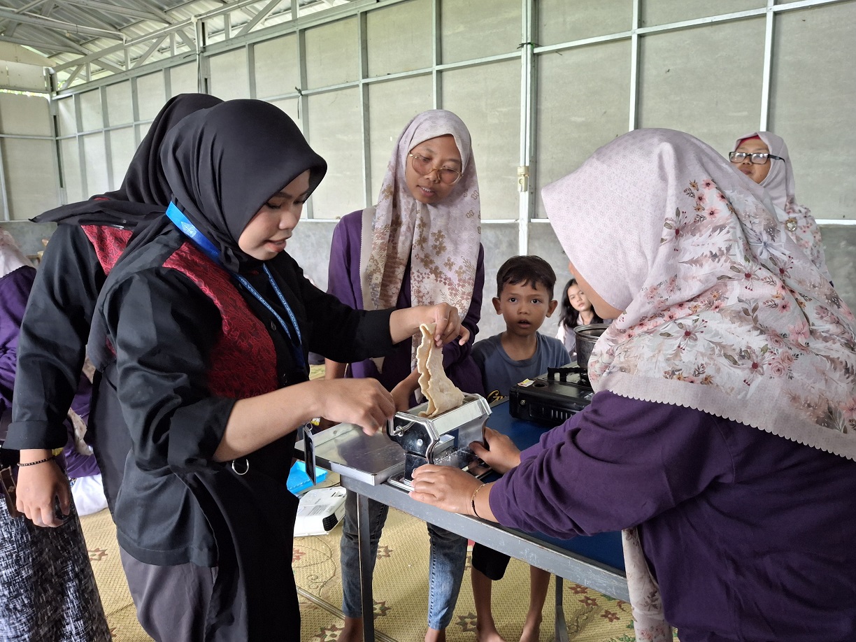 Resep mie ikan nila cukup sederhana dan bisa diproduksi rumahan. Komposisinya terdiri dari 155gram tepung protein tinggi, 100gram daging ikan nila, garam, jeruk nipis, serta tepung tapioka secukupnya. Ikan nila difillet, dimarinasi dengan jeruk nipis, lalu dihaluskan. Daging ikan dicampur dengan tepung dan diuleni hingga kalis, digilas menggunakan alat penggiling mie, dipotong, kemudian direbus ±3–5 menit hingga matang. Pelatihan juga dilengkapi dengan teknik penyimpanan dan cara menjaga tekstur mie agar tidak mudah lengket dan tahan simpan.