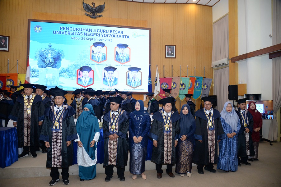 Universitas Negeri Yogyakarta (UNY) secara resmi mengukuhkan lima guru besar baru dalam sebuah upacara khidmat yang digelar di Ruang Sidang Utama Rektorat pada hari Rabu, (24/9/25). Pengukuhan ini diharapkan dapat memperkuat kontribusi universitas dalam bidang ilmu pengetahuan, pendidikan, dan teknologi, sekaligus menjadi motor penggerak inovasi untuk menjawab tantangan zaman. Kelima guru besar yang dikukuhkan berasal dari berbagai fakultas dengan keahlian yang beragam, yaitu Fakultas Teknik, Fakultas Ilmu Sosial dan Ilmu Politik, Fakultas Ekonomi dan Bisnis, serta Fakultas Vokasi. Mereka adalah Prof. Dr. phil. Ir. Didik Hariyanto, M.T., Prof. Dr. Ir. Sutopo, M.T., Prof. Dr. Miftahuddin, M.Hum., Prof. Dr. Ali Muhson, M.Pd., dan Prof. Dr. Ir. Heri Wibowo, M.T..