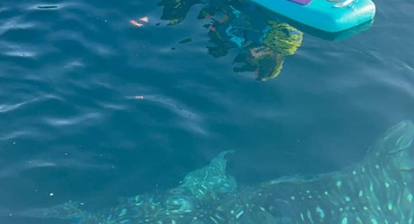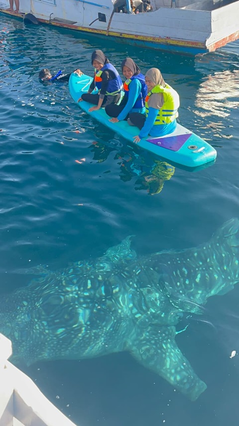 Tak lama berselang, lima ekor hiu paus muncul menyembul ke permukaan, menyapa para relawan yang beruntung pagi itu. Ikan raksasa yang dikenal dengan sebutan cucut ini mampu mencapai lebar mulut hingga 1,5 meter dan memiliki ratusan gigi kecil serta lembaran penyaring untuk menangkap plankton dan ikan kecil. Tidak selalu mudah bertemu hiu paus—mereka mengikuti jalur migrasi dan tidak setiap hari muncul ke permukaan. Namun Nola, salah satu individu yang dikenal warga, kerap menampakkan diri dan mempunyai corak kemerahan khas di bagian sirip.