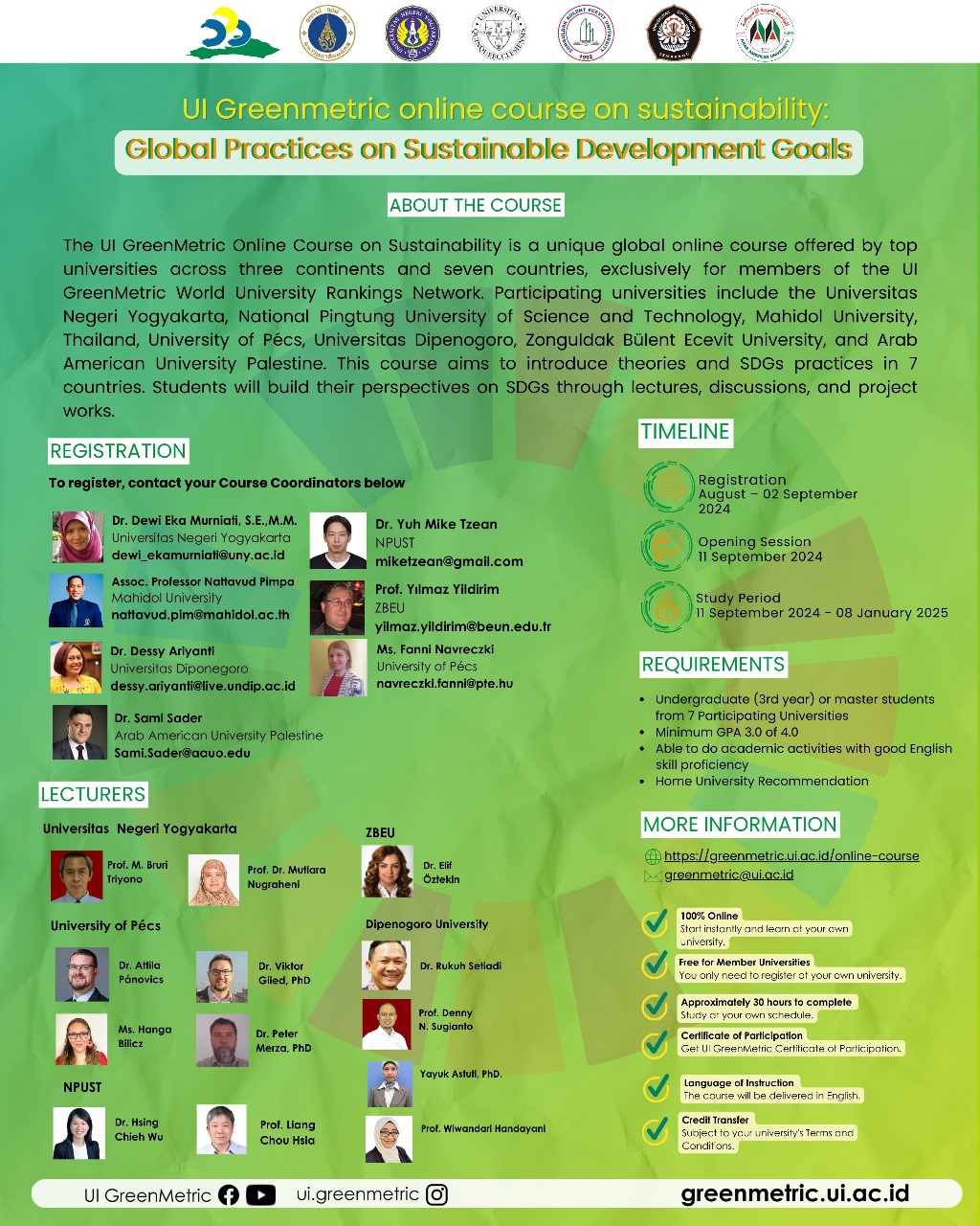 Universitas Negeri Yogyakarta (UNY) kembali memperkuat posisinya di peta pendidikan global dengan berpartisipasi dalam online course bertajuk "Sustainable Universities: Praktik Global untuk Sustainable Development Goals (SDGs)" pada September 2024. Kursus internasional ini merupakan hasil kolaborasi strategis dengan UIGreenMetric dan melibatkan tujuh universitas ternama dari empat benua, yaitu Taiwan, Indonesia, Thailand, Republik Türkiye, Hongaria, dan Mesir. Online course ini ditawarkan oleh Universitas Negeri Yogyakarta, Universitas Sains dan Teknologi Nasional Pingtung, Universitas Diponegoro, Universitas Mahidol, Universitas Zonguldak Bülent Ecevit, Universitas Pécs, dan Universitas 6 October.