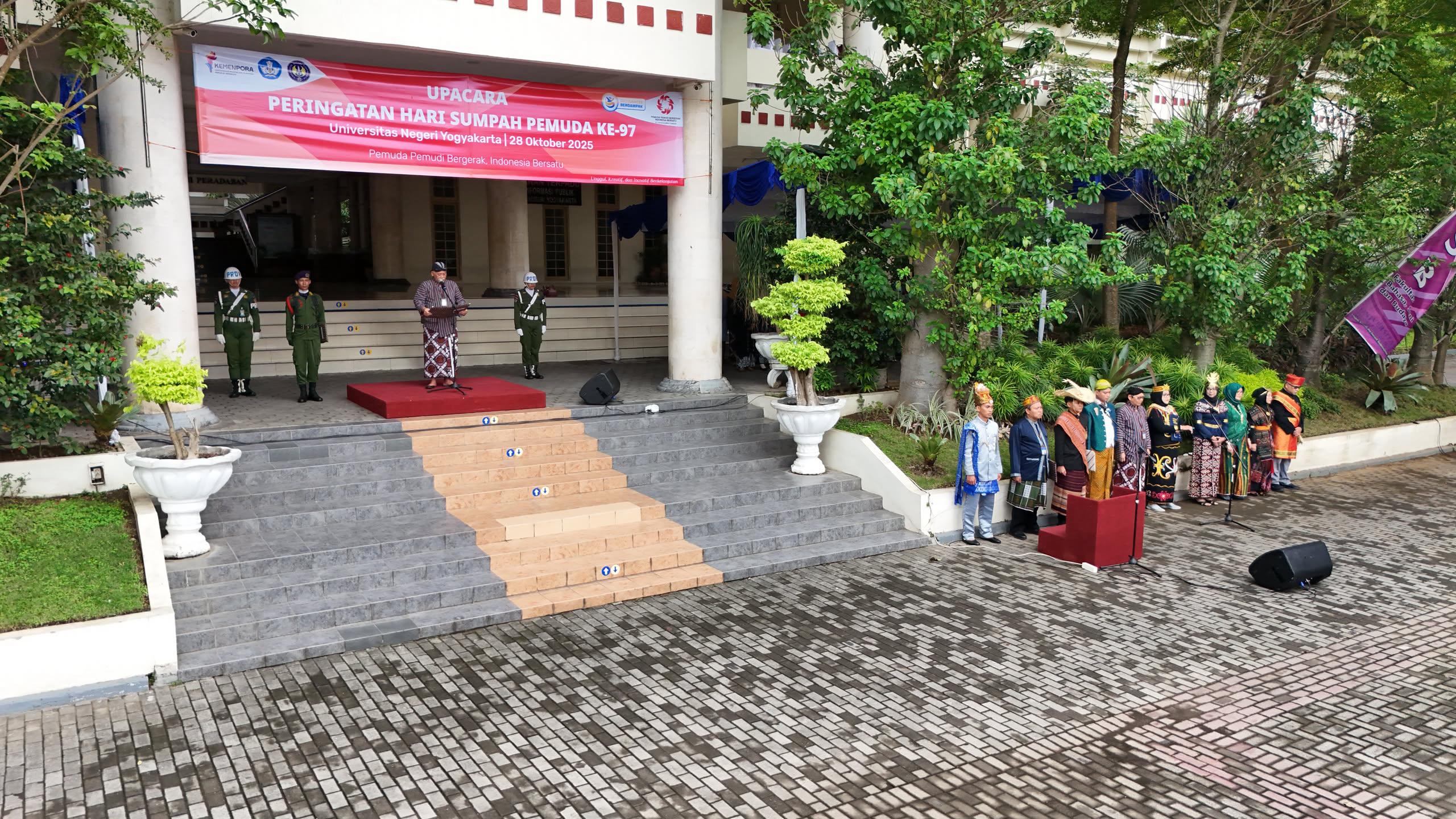 UNY menggelar upacara dalam rangka Hari Sumpah Pemuda ke-97 pada Selasa, 28 Oktober 2025 di halaman rektorat UNY dengan khidmat dan teratur.