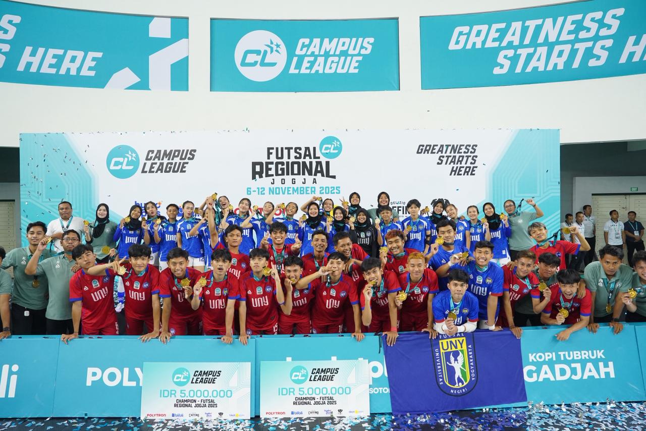 Unit Kegiatan Mahasiswa (UKM) Futsal Universitas Negeri Yogyakarta (UNY) kembali mencatat sejarah dengan meraih medali emas ganda di kategori putra dan putri pada Campus League Futsal Regional Yogyakarta 2025. Dominasi UNY terlihat sepanjang turnamen, mengukuhkan kampus biru sebagai kekuatan utama futsal perguruan tinggi di Indonesia.