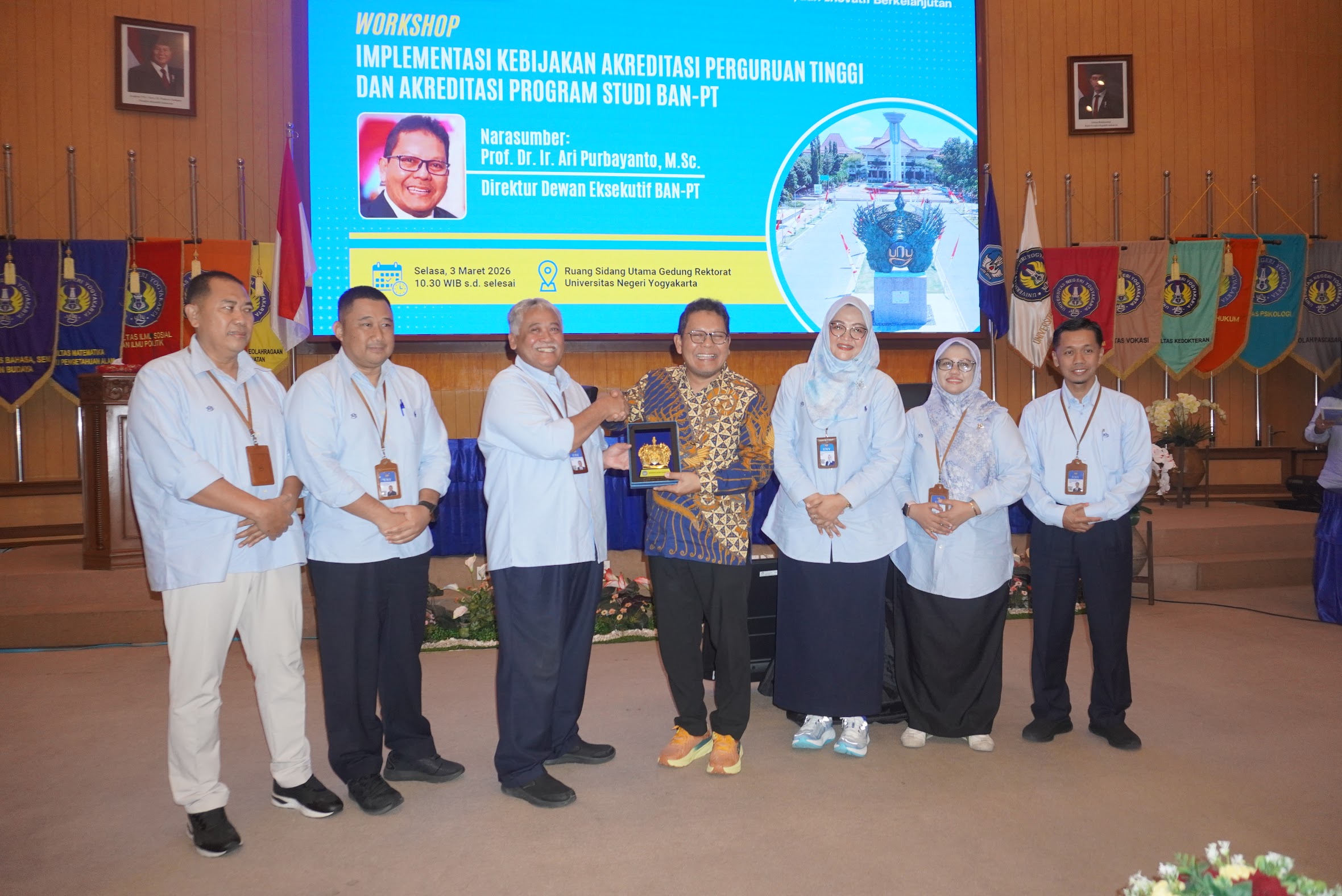Dalam rangka memberikan penguatan pemahaman sivitas akademika terkait kebijakan akreditasi perguruan tinggi (APT) maupun akreditasi program studi (APS) di bawah Badan Akreditasi Nasional Perguruan Tinggi (BAN-PT), Direktorat Penjaminan Mutu Universitas Negeri Yogyakarta (UNY) menyelenggarakan Workshop Implementasi Kebijakan Akreditasi Perguruan Tinggi dan Akreditasi Program Studi pada Selasa (3/3) di Ruang Sidang Utama Rektorat UNY. Kegiatan ini dihadiri Rektor, para pimpinan universitas, serta perwakilan perguruan tinggi mitra.