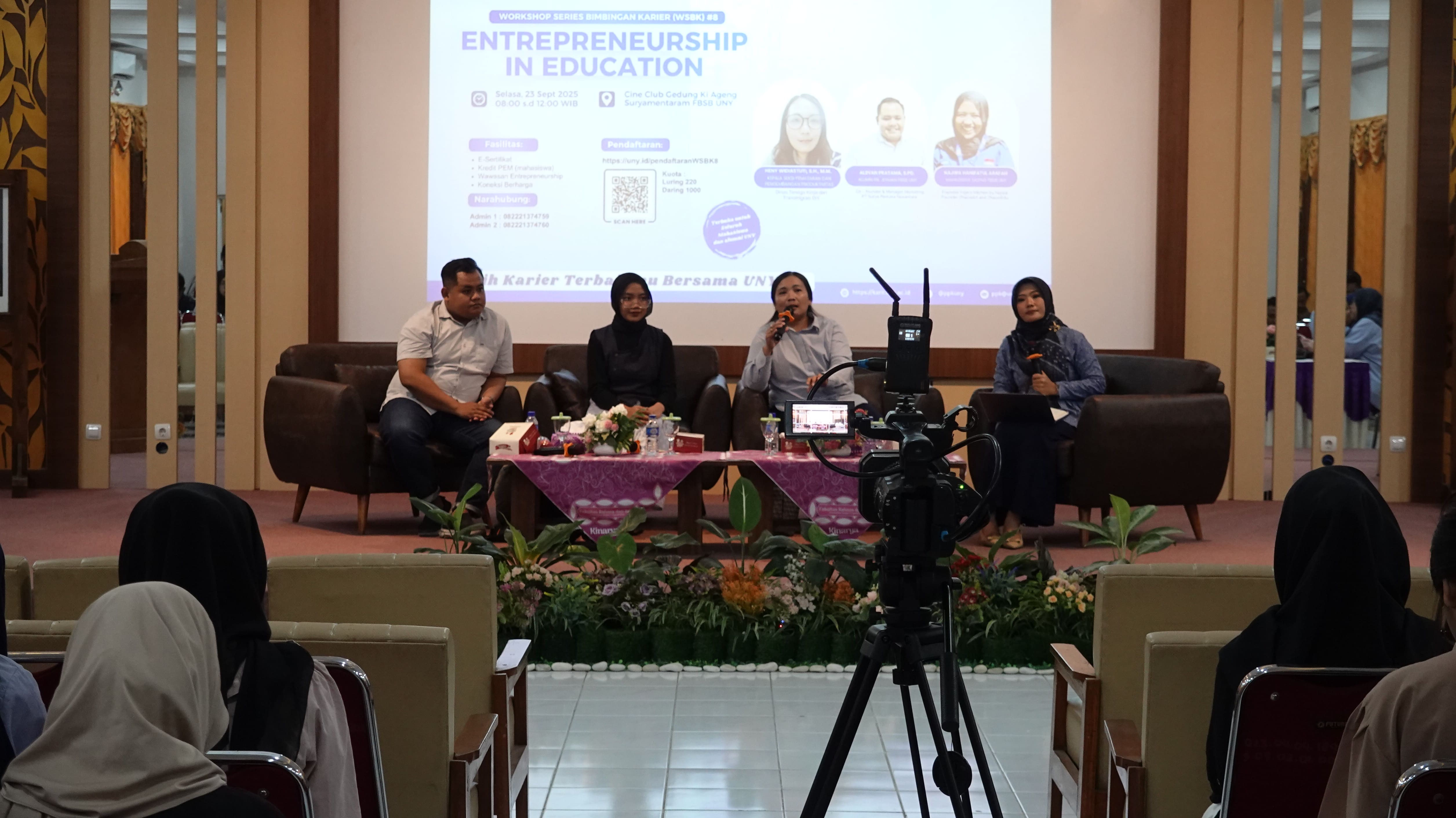 Berlokasi di Cine Club Gedung Ki Ageng Suryamentaram Fakultas Bahasa, Seni dan Budaya (FBSB) Universitas Negeri Yogyakarta (UNY), Workshop Series Bimbingan Karier (WSBK) ke-8 pada Selasa, 23 September 2025 berjalan sukses dengan tema "Entrepreneurship in Education". Acara ini bertujuan untuk menumbuhkan jiwa wirausaha, mengasah kreativitas, dan mempersiapkan mahasiswa untuk menghadapi tantangan global. Workshop dihadiri secara daring maupun luring oleh para mahasiswa dari berbagai fakultas maupun alumni dengan total terdaftar 1.234 peserta.