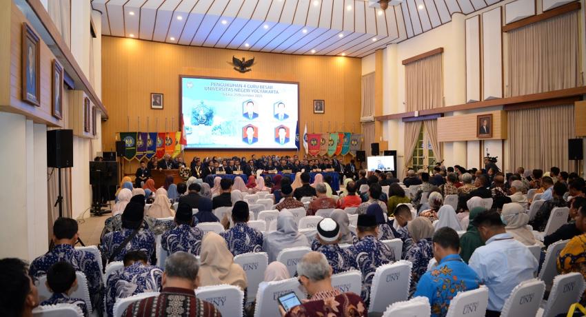 Universitas Negeri Yogyakarta (UNY) mengukuhkan empat guru besar yang digelar Selasa (23/12/25) di Ruang Sidang Utama Rektorat. Keempat akademisi tersebut adalah Prof. Dr. Nurhadi Santoso, M.Pd., Prof. Dr. Agung Nugroho, A.M., M.Si., Prof. Dr. Ir. Darmono, M.T., IPM., ASEAN Eng., dan Prof. Dr. Ir. Mujiyono, M.T., IPU., ASEAN Eng. Pengukuhan ini menegaskan konribusi UNY dalam penguatan mutu pendidikan, olahraga berintegritas, serta inovasi teknologi berkelanjutan.